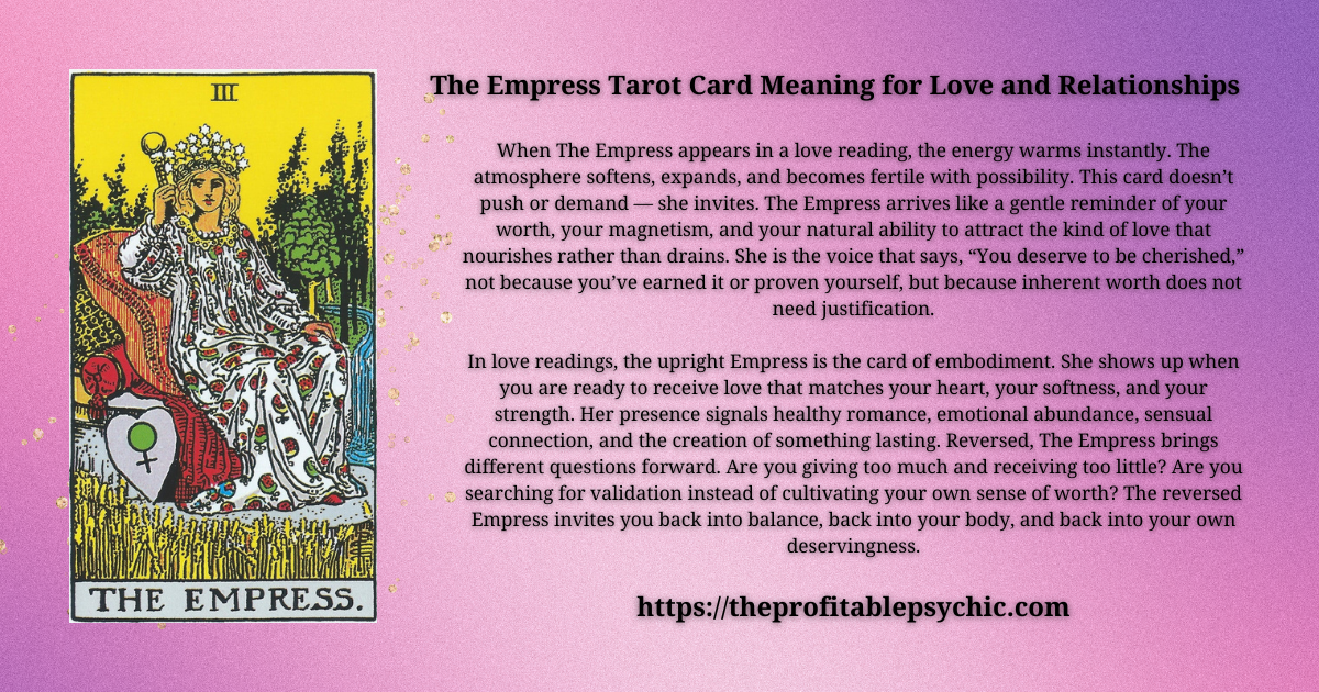For those actively seeking a partner, The Empress is a beacon of hope and alignment. She signals that attraction and opportunity are most potent when you are living from abundance, self-respect, and authenticity. This is not a card that rewards desperation, force, or frantic searching. Instead, The Empress shows that the most meaningful love comes to those who cultivate their own inner garden first — who nourish themselves emotionally, creatively, and spiritually.